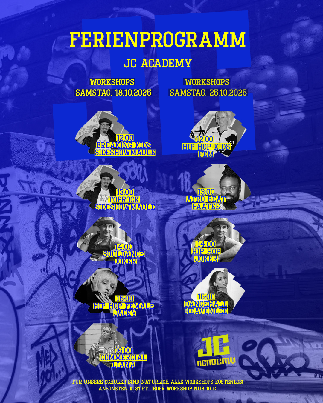 Unsere erfahrenen Coaches leben für den Tanz und begleiten dich mit Skills, Beats und Herzblut auf deinem Weg. Die JC Academy steht für Vielfalt, Community und kreative Freiheit – komm vorbei und werde Teil unserer wachsenden Community!